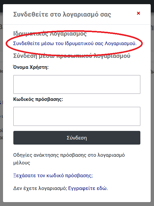 Στην επόμενη οθόνη εάν έχετε δηλώσει Ιδρυματικό Λογαριασμό στη Βιβλιοθήκη επιλέξτε “Συνδεθείτε μέσω του Ιδρυματικού σας Λογαριασμού“