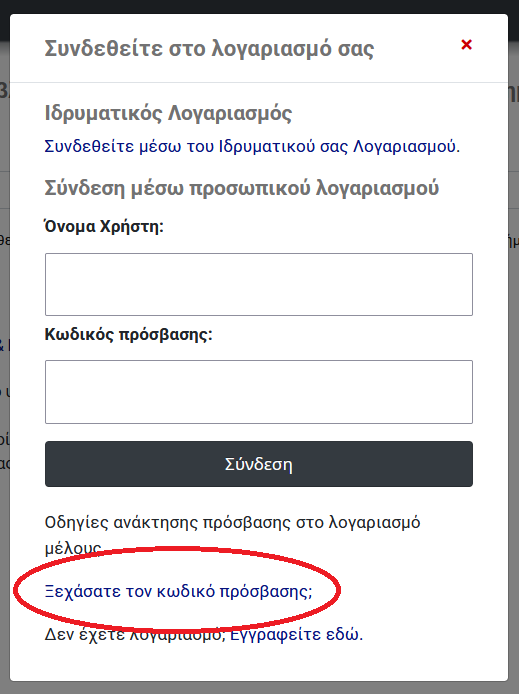 Στην επόμενη οθόνη εάν έχετε δηλώσει άλλο Λογαριασμό στη Βιβλιοθήκη επιλέξτε “Ξεχάσατε τον κωδικό πρόσβασης;“