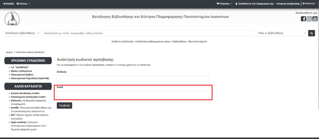 Ακολουθήστε τις αντίστοιχες οδηγίες ανάλογα με τον λογαριασμό e-mail που έχετε δηλώσει στη Βιβλιοθήκη.